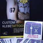 Ganz wichtig: Die Stelle an die das Tattoo kommt sollte nicht zu arg behaart sein, Haare mögen Klebetattoos nicht. Wir stellen auch eine Dose Haarspray bereit, dann hält das Tattoo circa 2 Wochen 🙂
